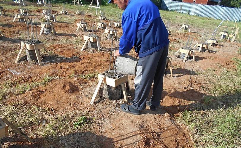 Столбчатое основание имеет систему столбов, которые расположены по точкам несущих стен и на стыках внутренних перегородок. Столб имеет две составляющие: нижнюю – основание (форма круглого сечения), верхнюю – оголовок (форма прямоугольника или квадрата). Важным моментом является установка столбов таким образом, чтобы все оголовки располагались четко на одной линии, поскольку именно на них будет впоследствии установлена конструкция каркаса. Высота их соответствует высоте пола и располагается около 60 сантиметров над уровнем почвы.