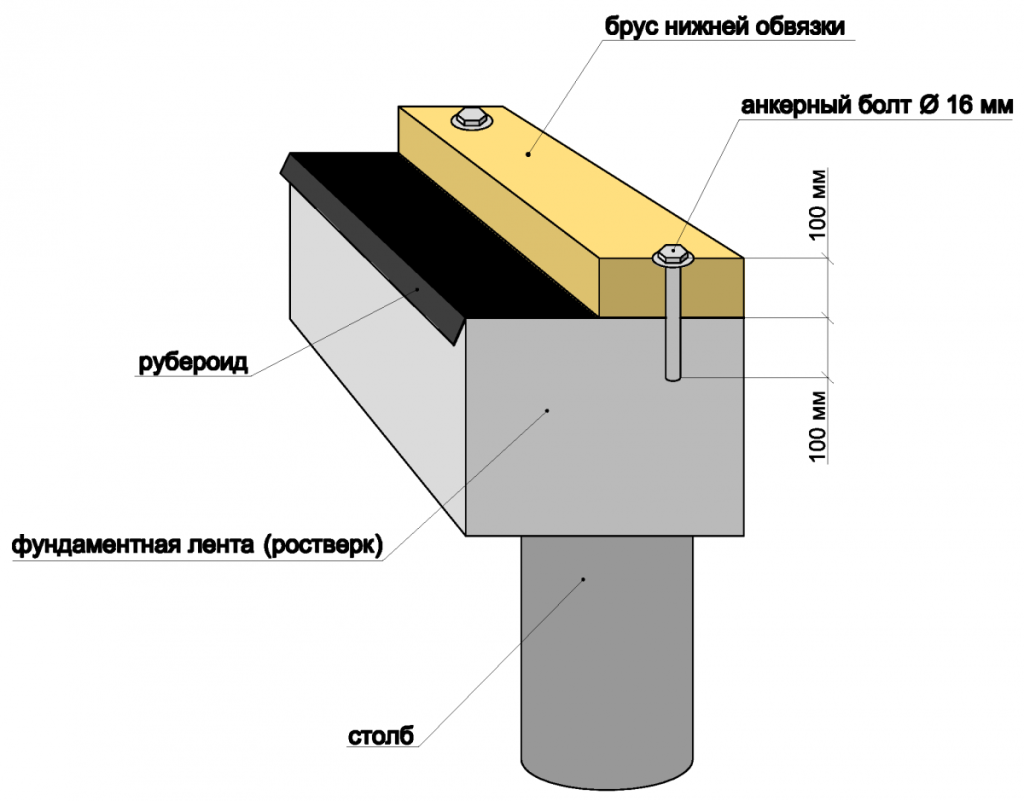 В качестве нижней обвязки используется брус сечением 100х150 мм или 2 доски 50х150 мм. Предварительно их нужно обработать антисептиками и подготовить отверстия в местах установки шпилек.