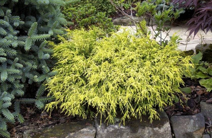 Многолетник создает впечатление воздушности и нежности. Он эффектно смотрится в одиночной композиции на газоне или в каменистом саду. В компанию к кипарисовику ‘Filifera Nana’ подсаживают: