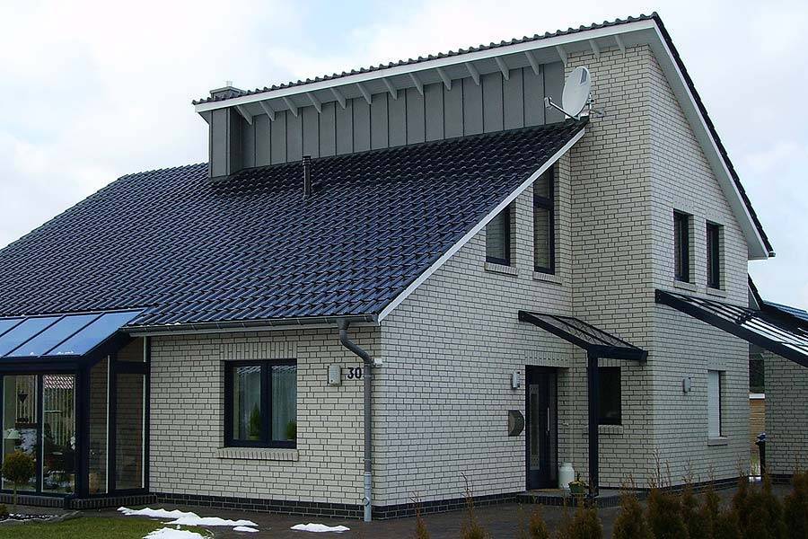 - Клинкерная плитка. Если для фасада применить облицовку клинкерной плиткой, внешний вид дома ничем не будет отличаться от фасада из клинкерного кирпича.