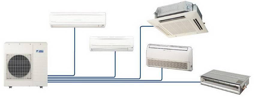 Включает в себя наружный блок с подключенными к нему несколькими (от 2 до 5) внутренними блоками мощностью 2-5 кВт. Чаще всего это настенные модели, но могут быть сочетания блоков канального, кассетного, потолочно-напольного типов кондиционеров.