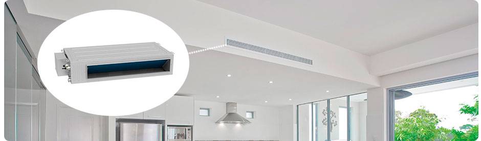 Внутренний модуль этой системы имеет толщину не более 25 см. В случае установки на потолке охлажденный или теплый воздух распространяется вверху помещения. При монтаже на полу поток устремляется вдоль стен. Устройства имеют высокую мощность и устанавливаются в фойе помещений, ресторанах, больших залах.