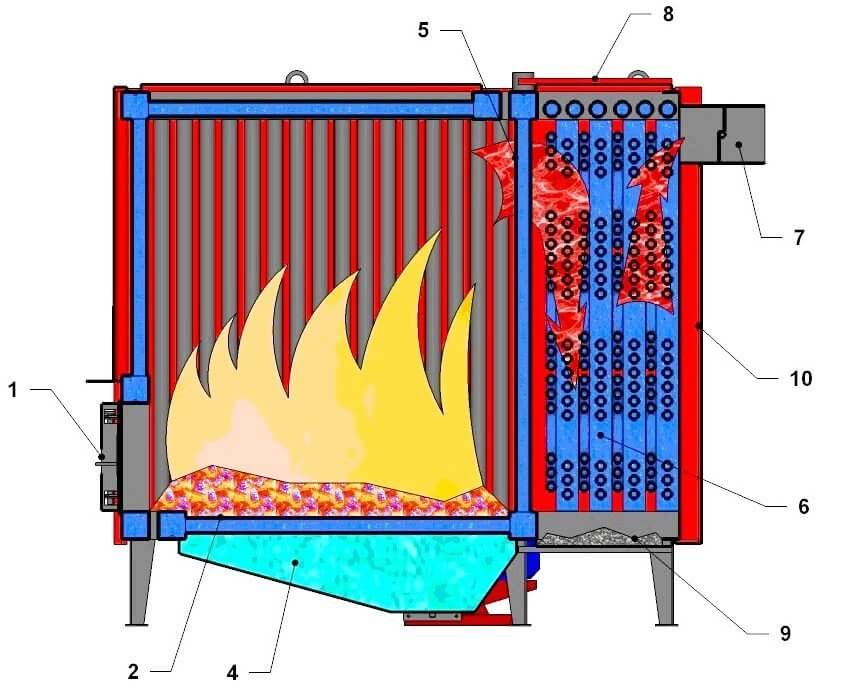 - Продукты сгорания, омывают фестон и переходят в конвективную часть, где охлаждаются теплоносителем, циркулирующим по трубам.