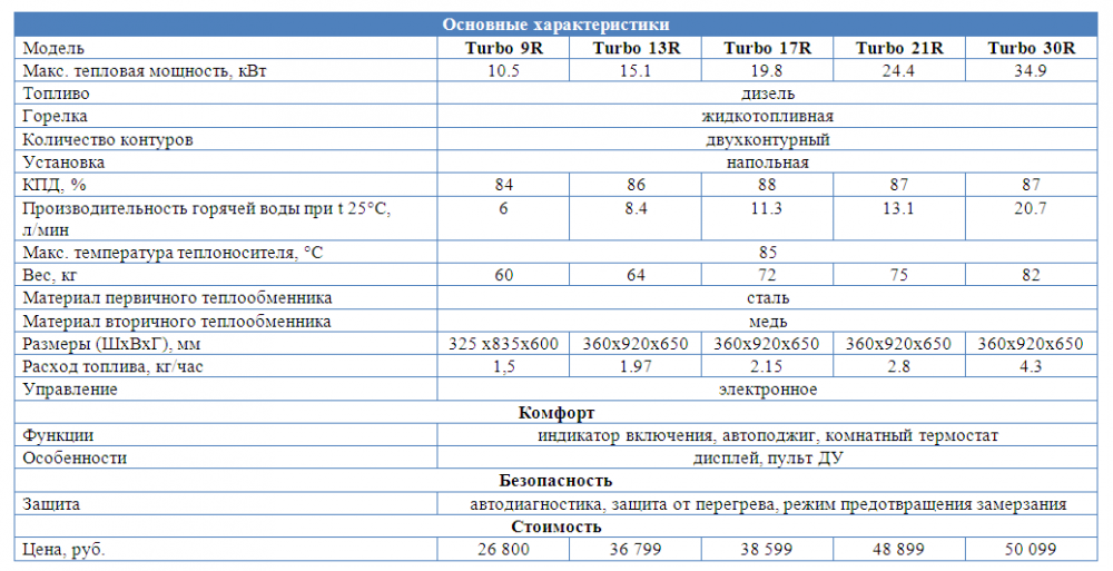 Серия представлена 5 моделями. Основные технические характеристики и цены, по которым можно купить дизельный котел Китурами Турбо, указаны в таблице.