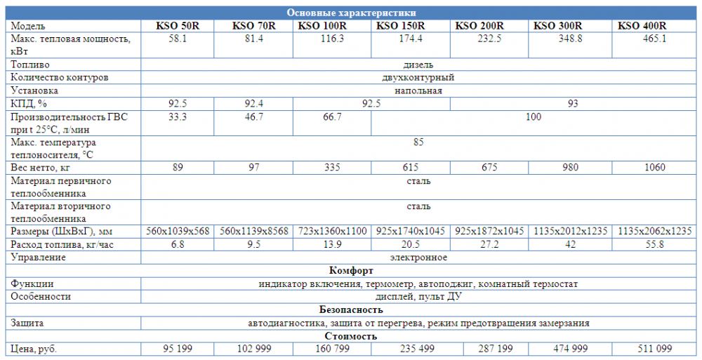 Серия представлена моделями в семи типоразмерах. В таблице даны технические характеристики котлов Kiturami KSO и стоимость, по которой их приобретают.