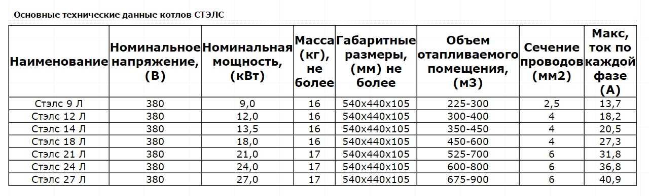 Трехступенчатая градация мощности и более надежные элементы не создают чрезмерной нагрузки на сети, потому многие котлы могут запитываться от сети 220В. Все данные по электрическому подключению приведены в таблиц.
