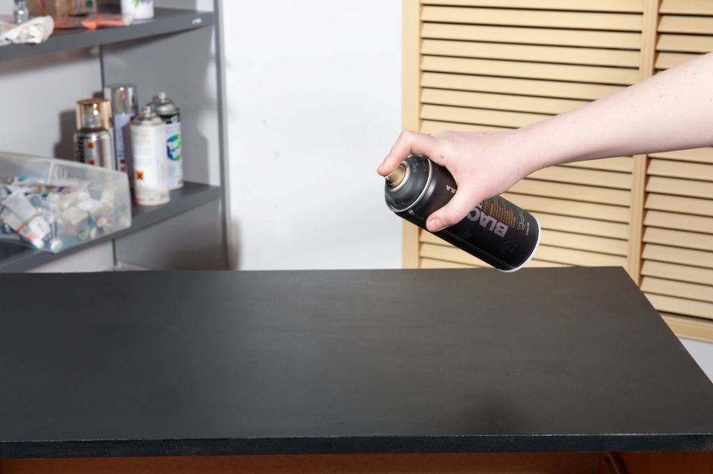 Наступает самый ответственный творческий момент, осталось покрасить мебель. Специалисты рекомендуют акриловые аэрозольные краски. С их нанесением легко справится новичок. Богатая палитра, которая включает краски со спецэффектами: металлик, флуоресцентные, молотковые, перламутровые и т.д. При распылении накладываются ровно и дают гладкое покрытие. Обладают хорошей сцепкой с окрашиваемой поверхностью и служат долго. Перед использованием флакона с краской предварительно хорошо встряхните его. Лучше расположить поверхность по горизонтали, чтобы избежать подтёков. На вертикальную площадь наносят краску снизу вверх. Требуется положить до 3 слоёв, каждый следующий наносят после высыхания предыдущего (через 25-30 минут)