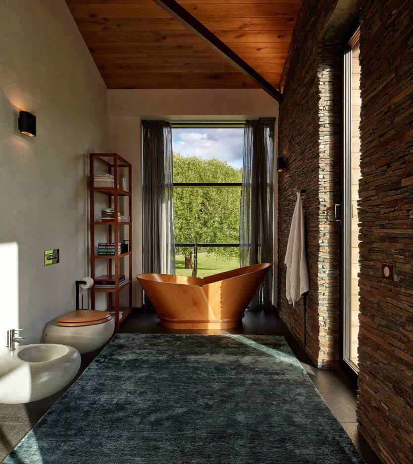 Естественный цвет хорошо работает в ванных комнатах. Бронза, беж и серый привносят приятный, теплый климат в интерьер, и этот эффект усиливается благодаря использованию в нем натуральных материалов. В комнате, устроенной таким образом, хорошо отдохнуть и привести себя в порядок, особенно, женщинам. Кожа выглядит намного лучше в окружении теплых тонов, чем, когда падающий на нее свет приобретает оттенок зелено-синих стен. Хотите, чтобы ванная комната была оформлена в экологическом духе, где можно расслабиться после трудового дня? Делайте ставку на земляную палитру.