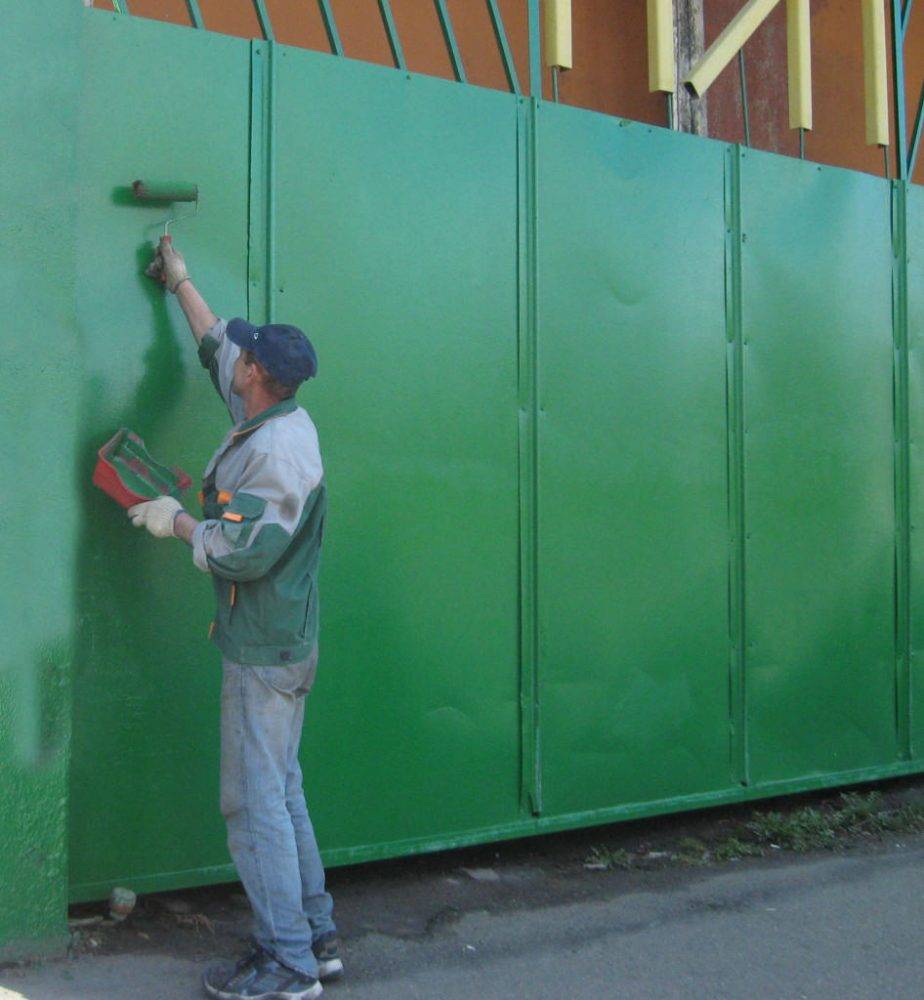 - Нанесение краски начинается с верхней части ворот, постепенно спускаясь вниз, что позволяет избежать потёков и наплывов;