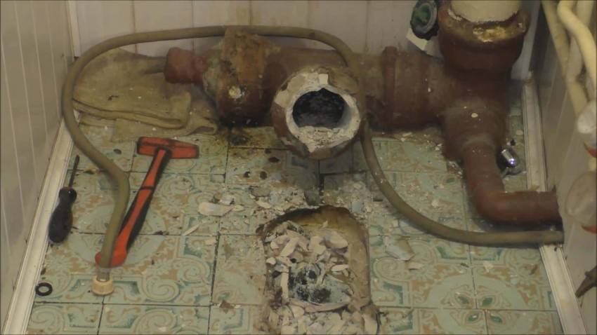 отключите подачу воды; отсоедините подводные шланги; извлеките шурупы (в некоторых случаях приходится разбивать бетон, поскольку выпуск зачастую также бетонируют); отбивайте раствор осторожно, если сантехника не должна повредится; если унитаз не нужен, просто сильно ударяйте под чашей, после разбития трубы демонтаж выполнить очень просто
