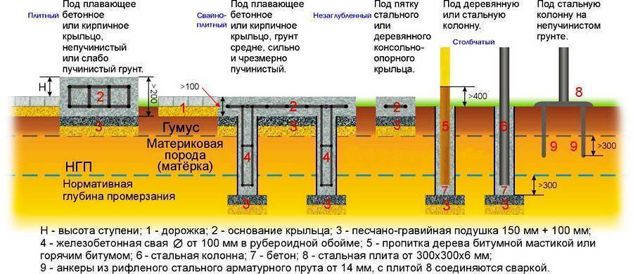 Для обустройства крылечка является свайный или столбчатый типы фундамента. Они оптимальны в соотношении сложности реализации и надежности. На схеме ниже вы можете видеть принцип сооружения этих и других типов основания. Однако если планируется просторная, тяжелая, сложная конструкция, под нее требуется возводить ленточный или плитный типы.