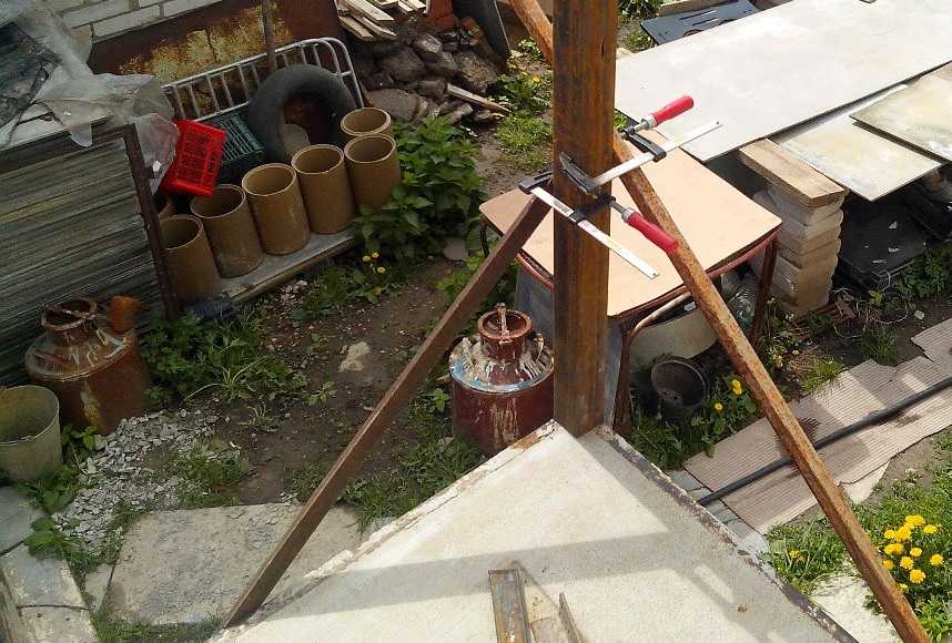 Пока бетон будет набирать прочность, принимаемся за стойки, которые будут поддерживать навес над крыльцом. Для них берем профилированную трубу 70*40*3 мм. Из нее нарезаем четыре колонны. Две чуть длиннее — они будут возле стены дома, две на 15 см короче — они стоят по наружному краю крыльца, создавая нужный уклон — чтобы вода-снег сходили нормально. Для перил и поперечин используем профилированную трубу 40*40 мм.