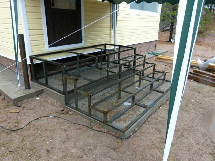 Для такого крыльца допускается закладка фундамента более облегченного варианта, так как металл является довольно упругим материалом поэтому, воздействие на его грунта не оказывает никакого влияния. А в некоторых случаях для такой конструкции фундамент совсем ненужен.