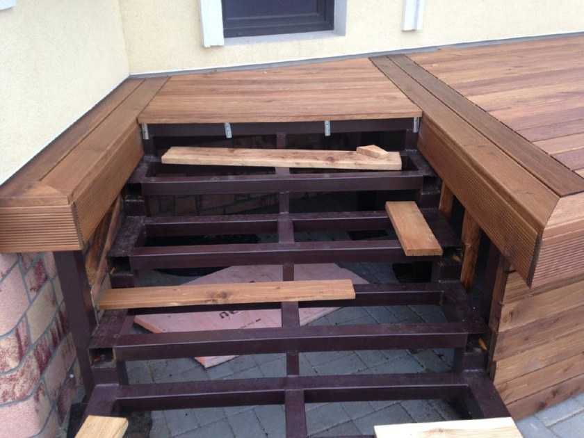Такие материалы обрабатывать не сложно. Из них создают функциональные и декоративные элементы, пол и ступени, перила и каркас навеса. Дерево обладает меньшей прочностью по сравнению с иными вариантами. Это надо учитывать в расчетах нагрузок. Его придется хорошо защитить от природных воздействий.