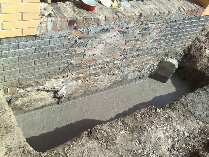 При устройстве связей тоже возможно образование трещин, но уже не только на стыке, а еще и в «теле» пристройки. Это происходит, если устроенные армированные связи не могут компенсировать неравномерную нагрузку, создаваемую домом и пристройкой. Поэтому связанный фундамент для крыльца делают, если пристраивается оно к тяжелому дому и само — тяжелое и массивное, сделанное из армированного бетона. Вторая сложность при таком решении — сделать связь качественной. Для этого используют ребристую арматуру диаметром 12-16 мм, под которую с заданным диаметром сверлят в фундаменте отверстия. В них забивают арматуру и на ее основе вяжут каркас для крыльца.