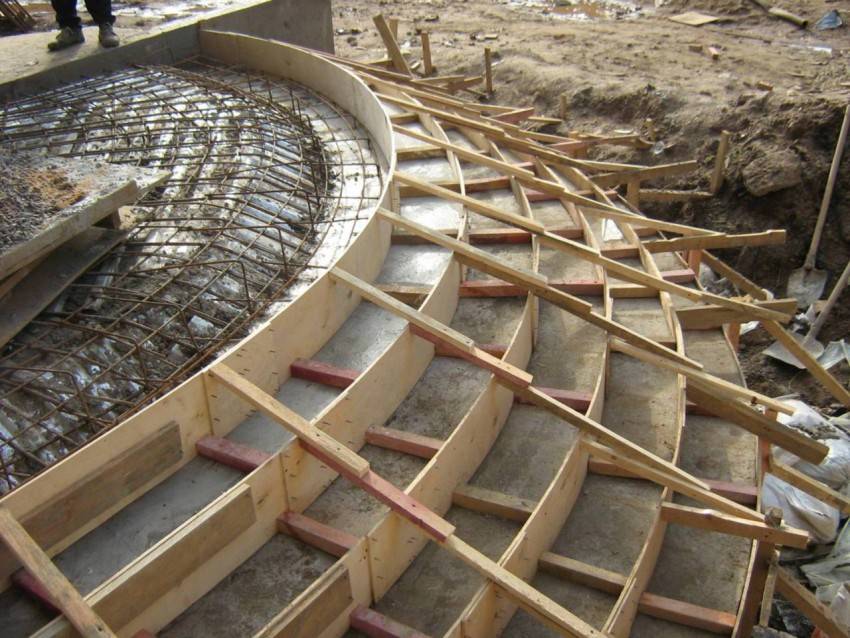 Сооружение опалубки к ступеням. Перед тем как поставить щитки можно сварить для ступеней металлический каркас, который послужит, как армированное основание для заливки. Либо просто уложите арматуру перед заливкой.