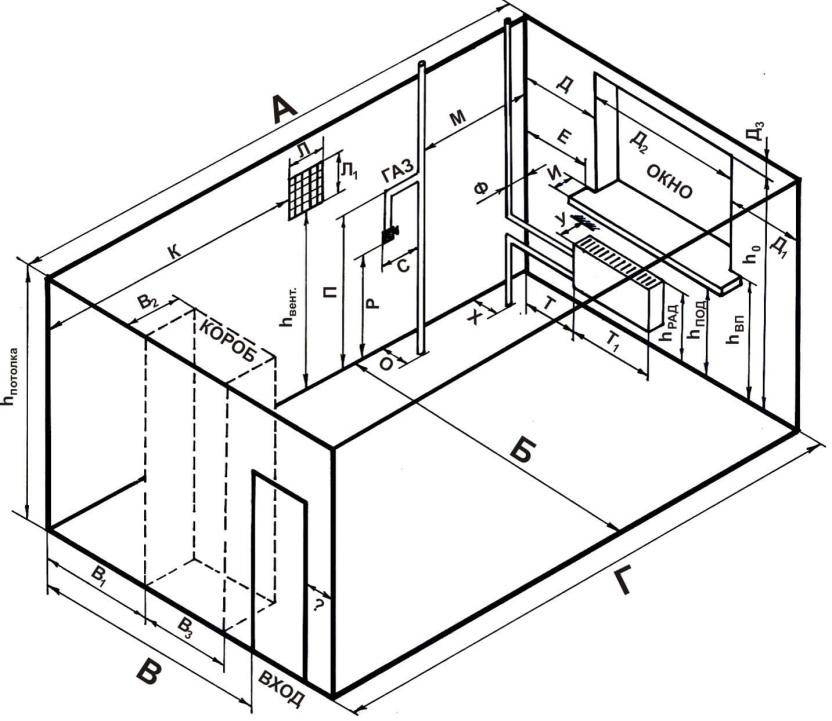 Методика замера «от угла», позволяет своевременно выявить неровности стен. На изображении ниже, приведен пример эскиза с буквенными обозначениями необходимых замеров: