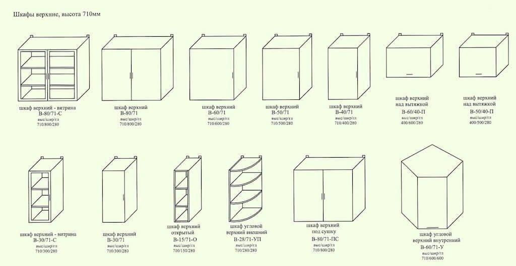 - высота выбирается персонально, используется площадь кухни и рост хозяев. Оптимальное значение такое, чтобы без табурета, на полную вытянутую руку можно было достать до верхней точки шкафа;
