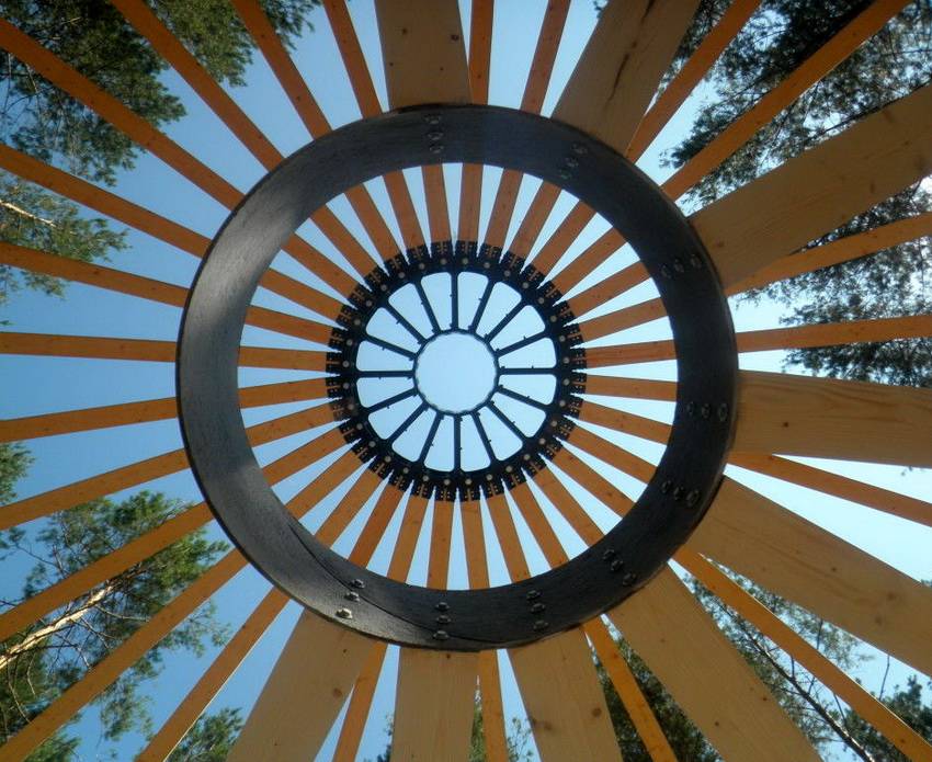 Конструкция возводится из деревянных брусьев. Сечение бруса подбирается индивидуально с учетом предполагаемых нагрузок на купол строения.