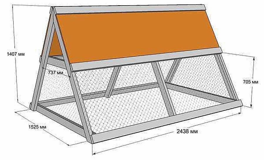 Мини-курятник может иметь вид клетки. Габариты клетки для нескольких кур — 1х2 м. Фундамент для него не нужен, он ставится на траву.