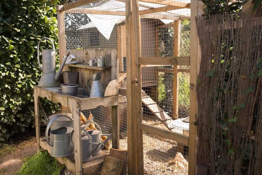 При желании в летний курятник можно переделать старый парник. При этом сам домик может быть небольшим, а зона для выгула просторной. Гнёзда для птиц можно оборудовать сбоку курятника, в отдельном отсеке.
