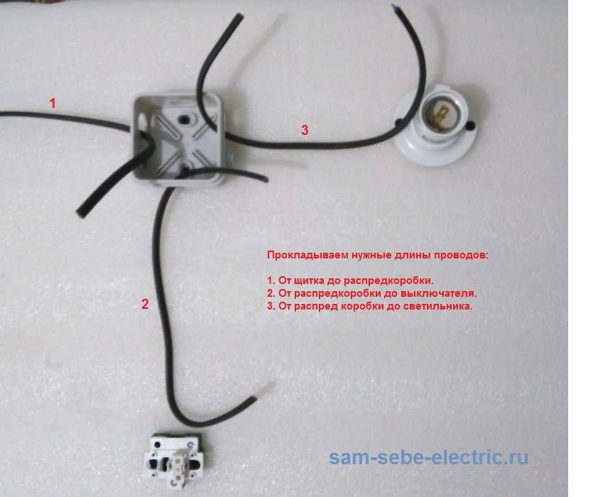 Далее разделываем все концы проводов и зачищаем жилы. В распредкоробке необходимо зачистить жилы на 3-4 см для создания надежной скрутки, а в патроне и выключателе нужно зачищать на 5-8 мм для подключения к контактам.
