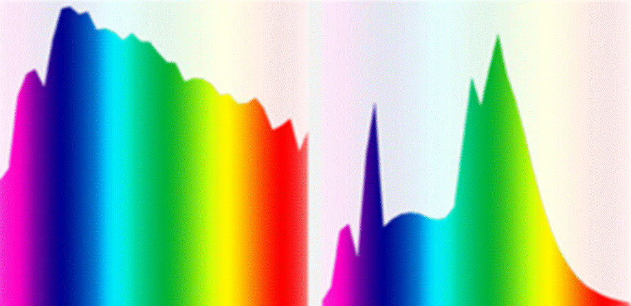 Слева показан спектр солнечного света, справа – спектр качественной люминесцентной лампы. Свет солнца обладает более ровной характеристикой, однако сходство определенно наблюдается. У ЛЛ присутствует ярко выраженный пик в зеленой области, тогда как в красной области налицо падение.