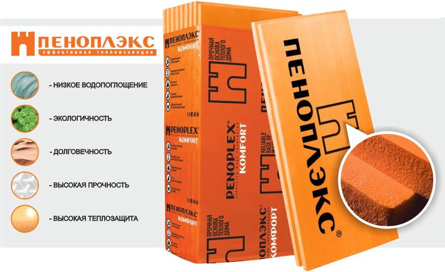 Надо отметить, что утеплитель ПЕНОПЛЭКС обладает высокими теплозащитными характеристиками — коэффициент теплопроводности материала составляет не более 0,034 Вт/ м∙°С.