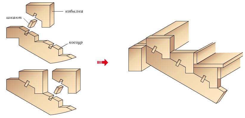 Одномаршевая лестница состоит из косоуров, перил, проступей и подступенков. Проступью называют горизонтальную часть ступени, подступенком – вертикальную. Косоуры – это несущие элементы конструкции, имеющие по верхнему краю специальные вырезы для крепления ступеней. Вместо косоуров часто используют тетивы – несущие балки с пазами для ступеней. Подступенки и перила не являются обязательными элементами, но для удобства и безопасности лучше, когда они присутствуют.
