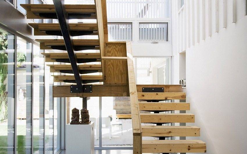 Если в конструкции используются косоуры, то собирается такая лестница намного проще и быстрее, поскольку детали крепятся на 2-х или 3-х опорах