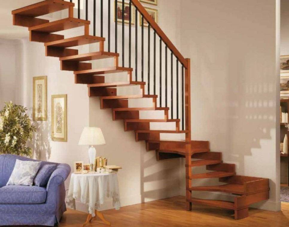 Не во всех помещениях имеется такое расстояние, поэтому лестницу делают поворотной, придавая ей Г или П-образную форму. Сам поворот делают либо из угловых ступенек, либо вставляют межэтажную площадку.