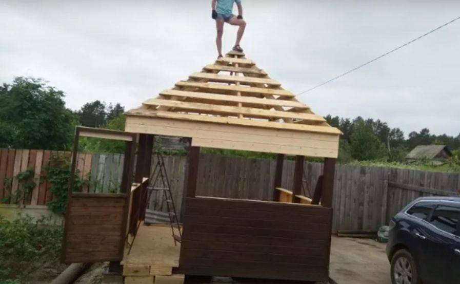 Сооружение крыши необременительно и при наличии стройматериала выполняется быстро. Пол может отсутствовать, достаточно тщательно выровнять поверхность. Однако заметьте, что в ветреную погоду и при интенсивных передвижениях будет пыльно, поэтому лучше выстелить тротуарной плиткой или природным камнем всю площадь.