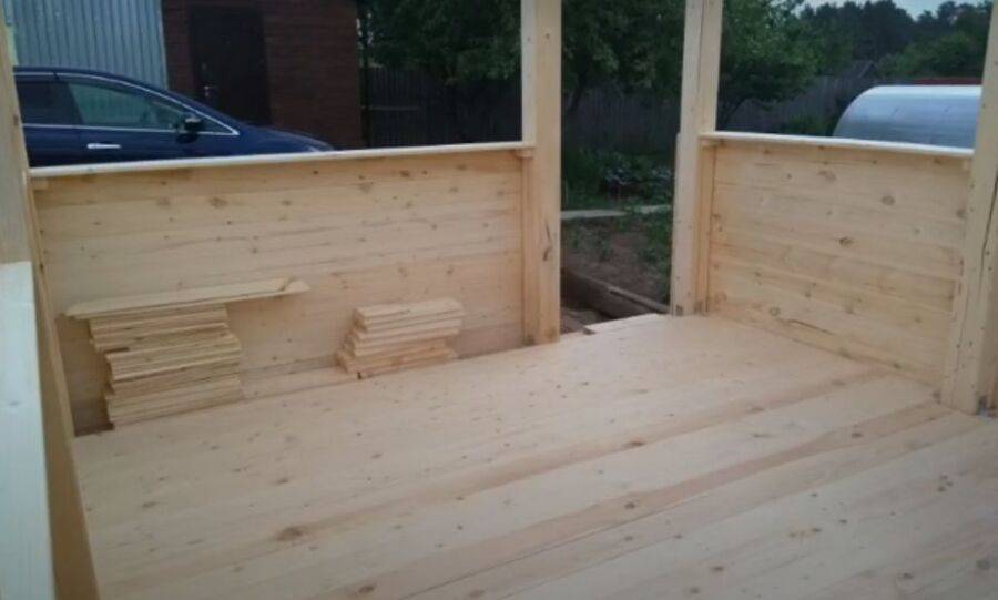 - На основание можно настелить доски либо выложить плитку. После этого либо устанавливаются столбы из профильной трубы из металла или другого выбранного владельцем материла, либо возводятся две стены из кирпича или бруса.
