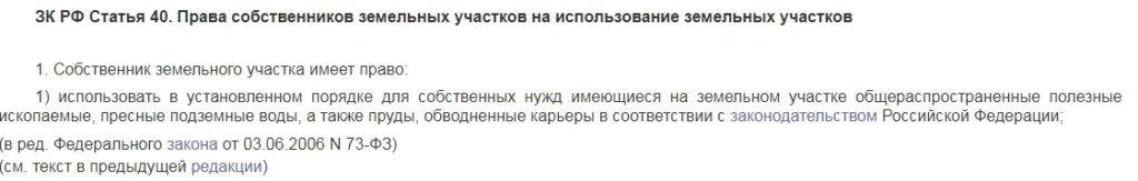 Согласно п.1 ст. 40 ЗК РФ, собственник имеет право использовать полезные ископаемые, подземные воды и другие ресурсы, которые находятся в пределах его земельного участка.
