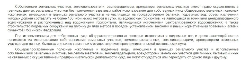 В статье 19 закона №2395-1 от 21.02.1992 указано: собственник земли имеет право на бесплатную добычу полезных ископаемых (в том числе и воды) без использования взрывных работ. Причем установлен предельно допустимый объем, составляющий 100 м3 в сутки. Эти водоносные горизонты должны находиться над источниками централизованного водоснабжения.