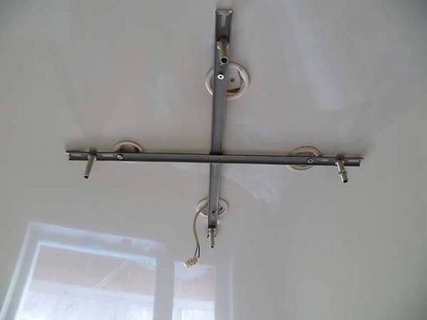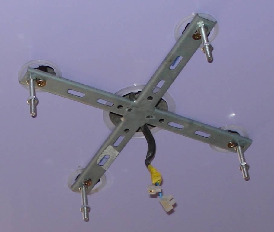 Крестообразная планка используется в случаях, когда подвешивается тяжелая люстра. Поэтому лучше распределить нагрузку на 4 шпильки. Зачастую данный крепежный элемент имеет достаточно большое основание, поэтому трудно найти подходящее термокольцо. Единственным верным исходом будет крепление закладной наверху пленки натяжного потолка. Для этого выполняются следующие шаги: