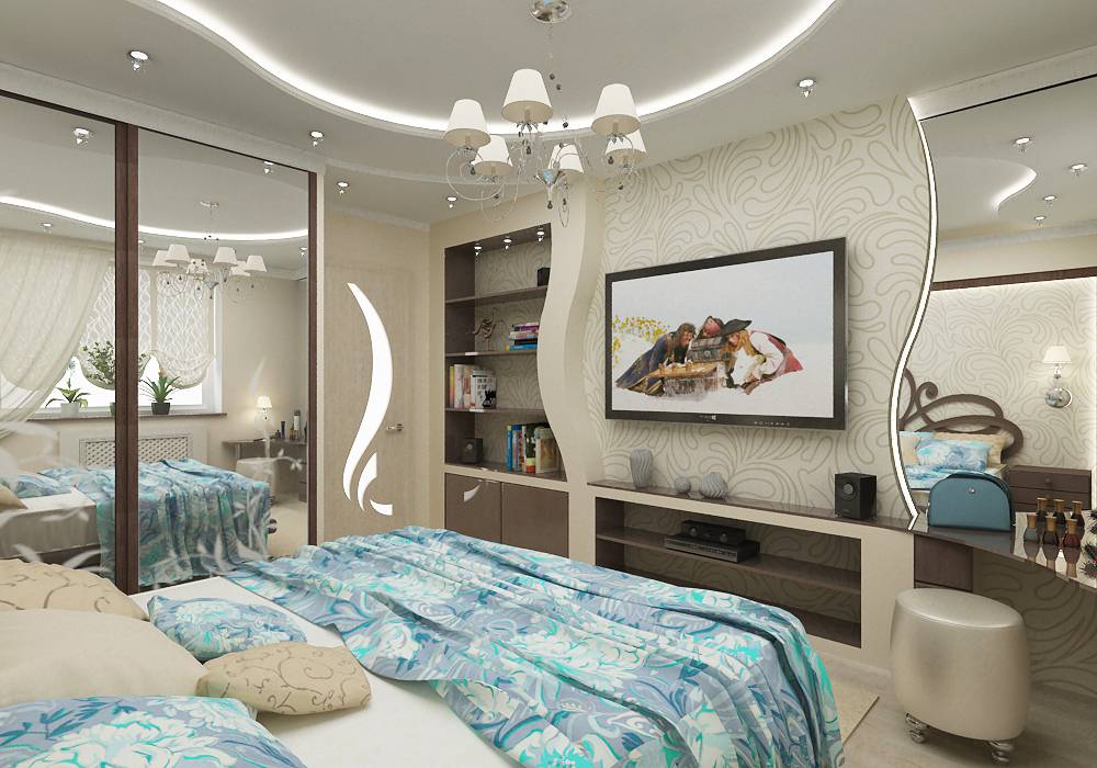 Многоуровневый натяжной потолок можно оборудовать встроенными светильниками или подсветкой по периметру. Подобный дизайн сформирует в спальне завораживающую обстановку. Популярный вариант для комнаты отдыха — применение зонального освещения. К примеру, место с туалетным столиком предполагает более яркий свет, а над кроватью устанавливают источники с приглушенным световым потоком.