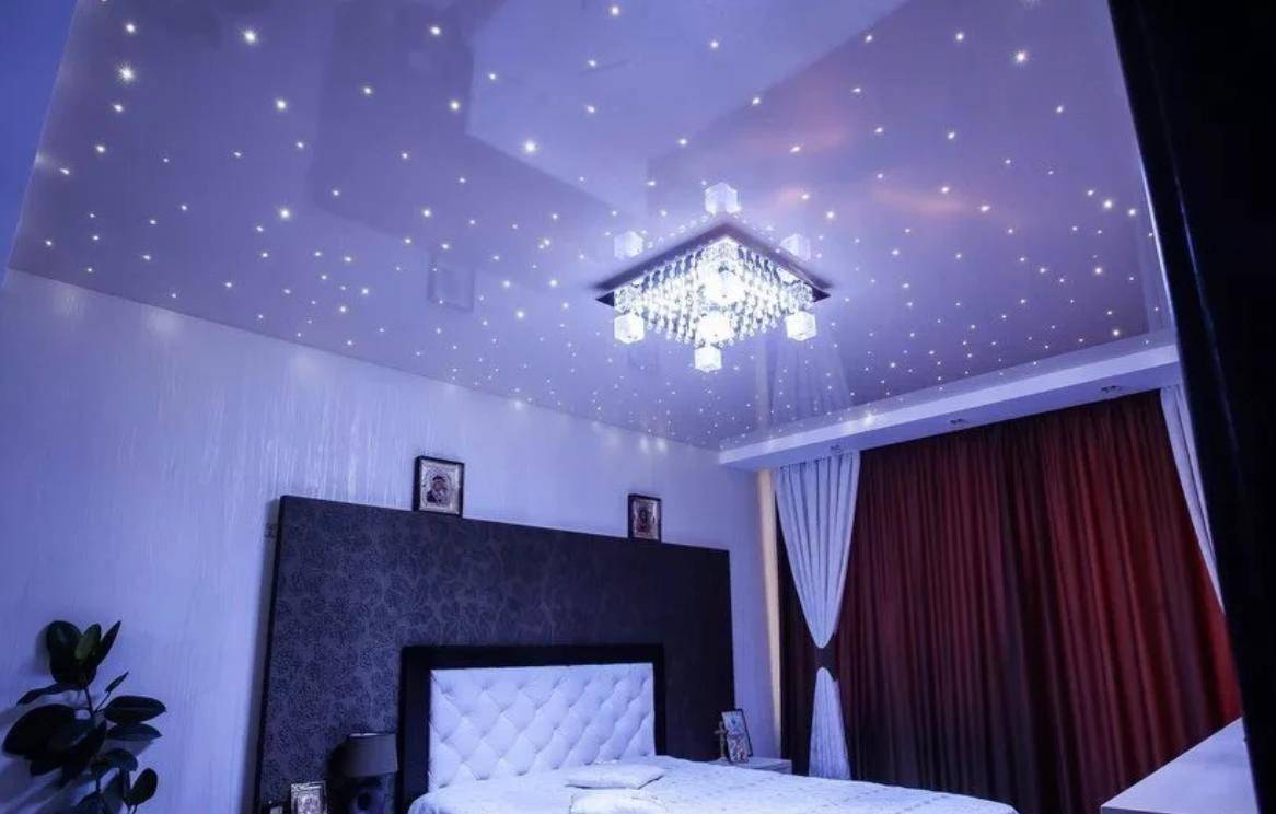 Такой вариант непрост в реализации, но выглядит очень эффектно. К тому же тематика прекрасно подходит для спальни. В качестве основы выступает плёнка тёмных тонов, например, чёрного или синего. Часто наносят фотопечать в виде космоса. Звёзды имитирую с помощью оптоволокна с проектором, небольших диодов или булавок «Старпинс», пропускающих отдельные лучи запотолочной подсветки.