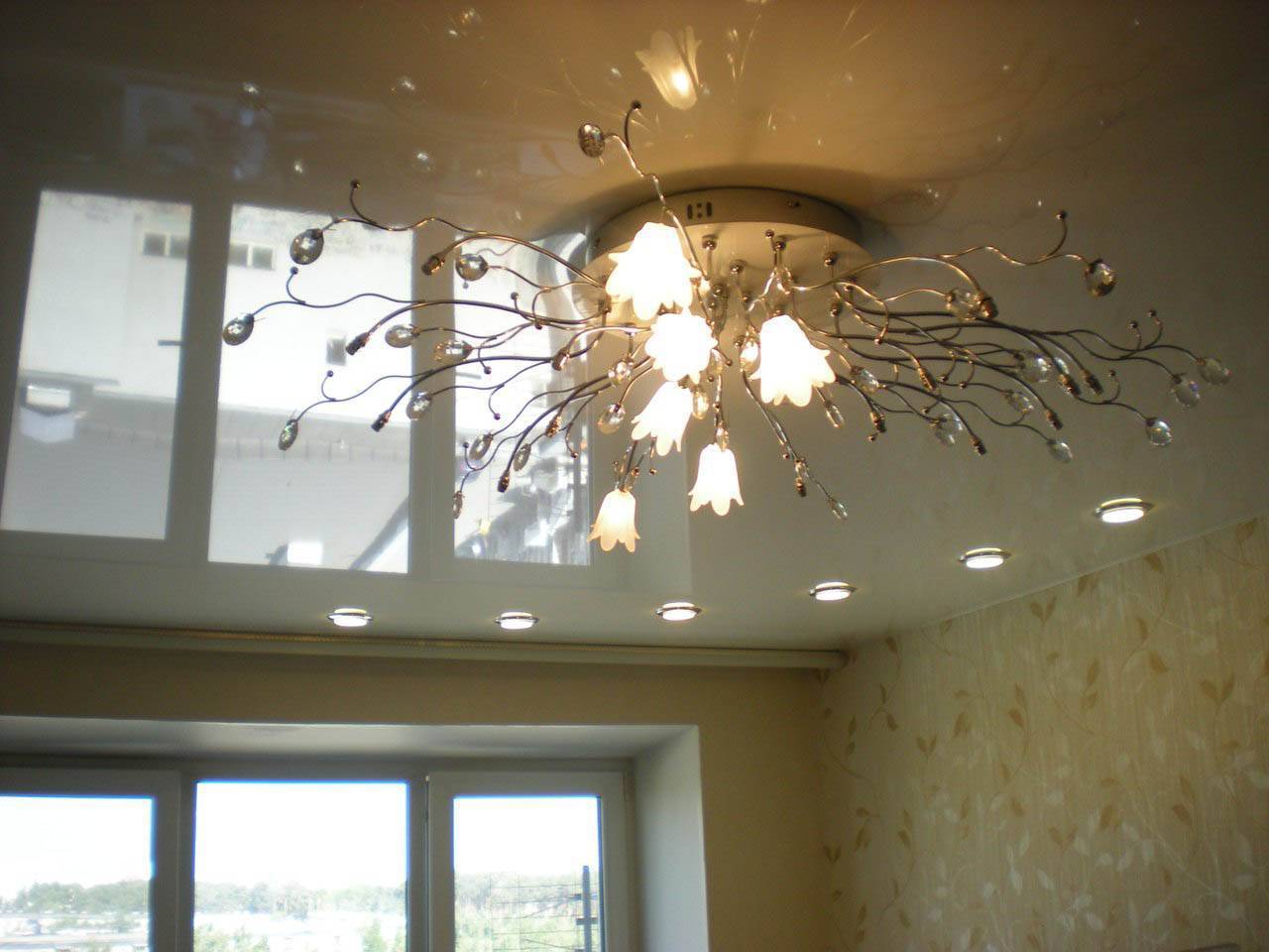 Рекомендуется установка источников с рассеянным светом. Например, прекрасно подойдет люстра с плафонами из матового стекла или модель со световым потоком, направленным вверх. Однако последний вариант способен испортить натяжной потолок так, как полотно не выдерживает высоких температур. В данном случае решить проблему можно с помощью светоотражателей или лампочек, имеющих низкую мощность.