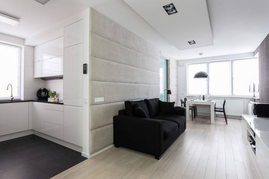 Если в гостиной планируется спальное место, то важно, чтобы звон приборов и другой кухонной утвари не был слышен. Бесшумные посудомоечные машины и прочая техника придутся кстати.