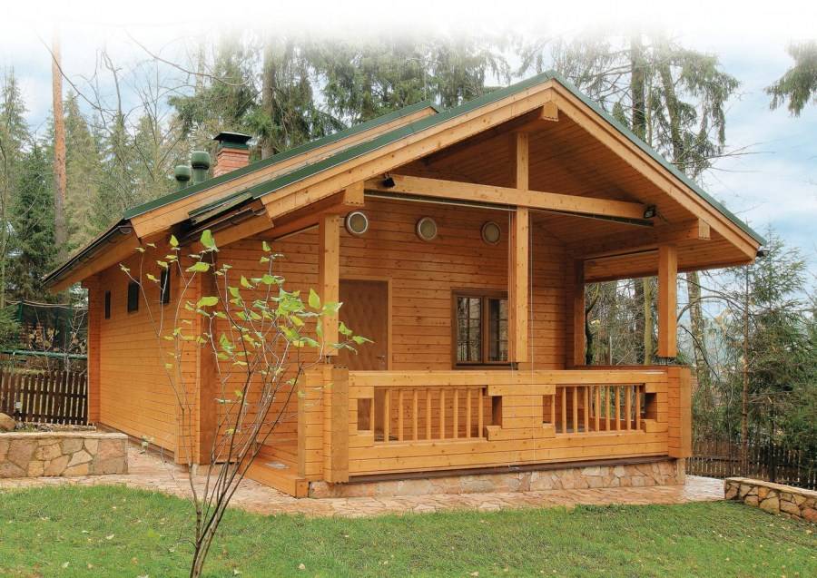 Каркасная баня может быть оборудована террасой для посиделок в теплое время года