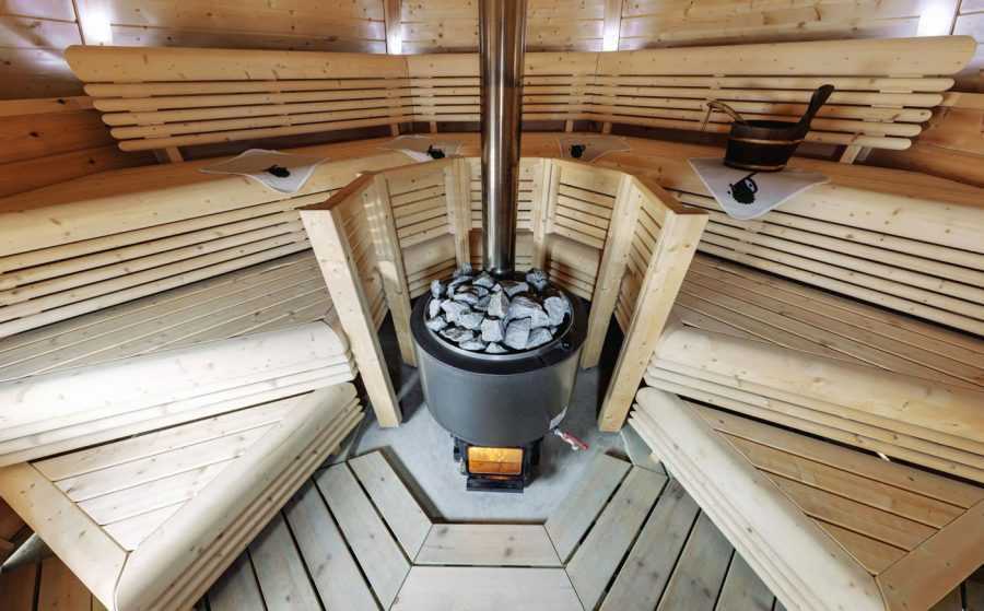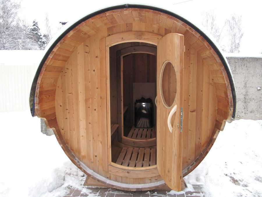 Подобное строение представляет собой габаритную бочку, изготовленную из древесины. Она разделена специальной перегородкой на две функциональные зоны: парную и душевую – для проведения оздоровительных и водных процедур, предбанник – для монтажа отопительного оборудования. Мобильная бочкообразная баня способна вместить от 2 до 4 человек за один сеанс.
