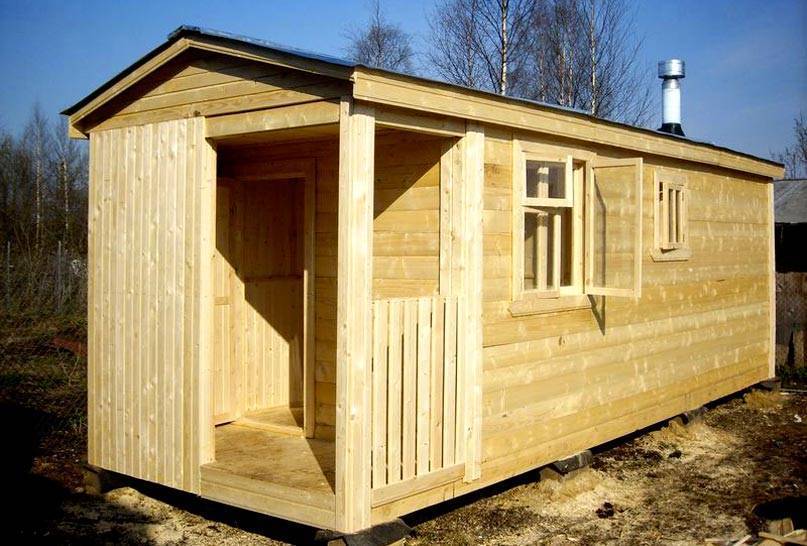 Для возведения стен используется обрезная доска из лиственных пород деревьев толщиной до 6 см. Мобильная экономбаня не требует обустройства фундамента, но для повышения устойчивости конструкции рекомендуется использовать дополнительную деревянную основу из досок толщиной до 5 см.