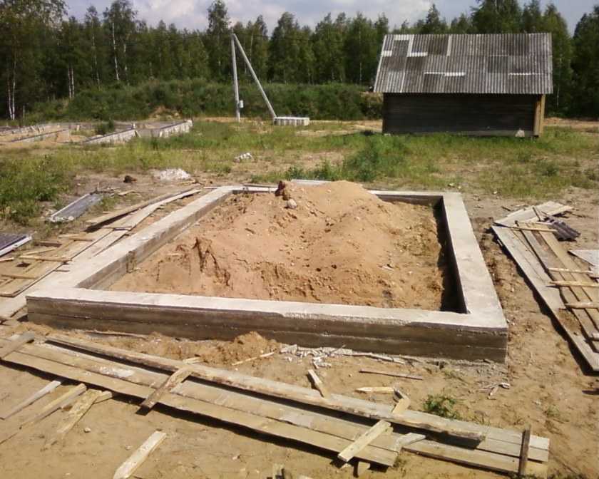 Разметку сделайте веревкой по периметры. Проверьте диагонали углов с допуском 3-4 см. Снимайте природный слой грунта и копайте траншею для песка. Готовый котлован имеет длину — 20 см, максимальный уровень высоты – 40 см.