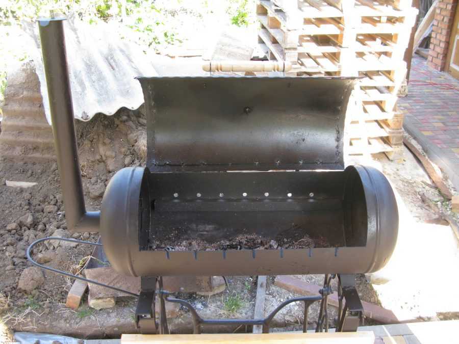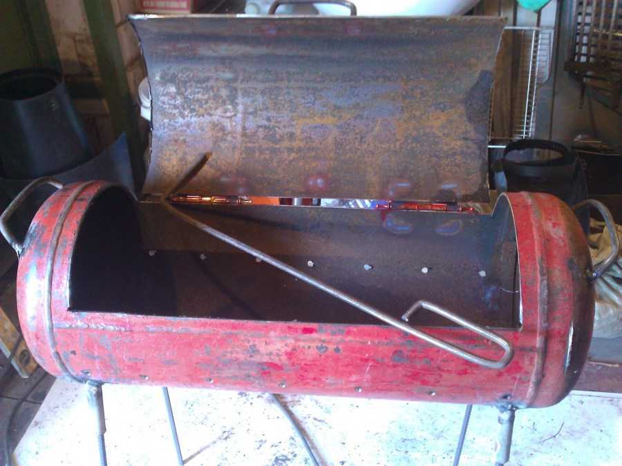 Затем остается лишь приварить петли для открывания крышки, очистить внутреннюю поверхность от продукта, который хранился в этой таре, снять стандартный слой ЛКМ (лакокрасочных материалов) снаружи и окрасить корпус специальной жаростойкой краской, выдерживающей экстремальные эксплуатационные температуры.