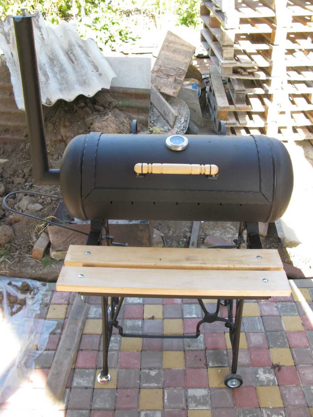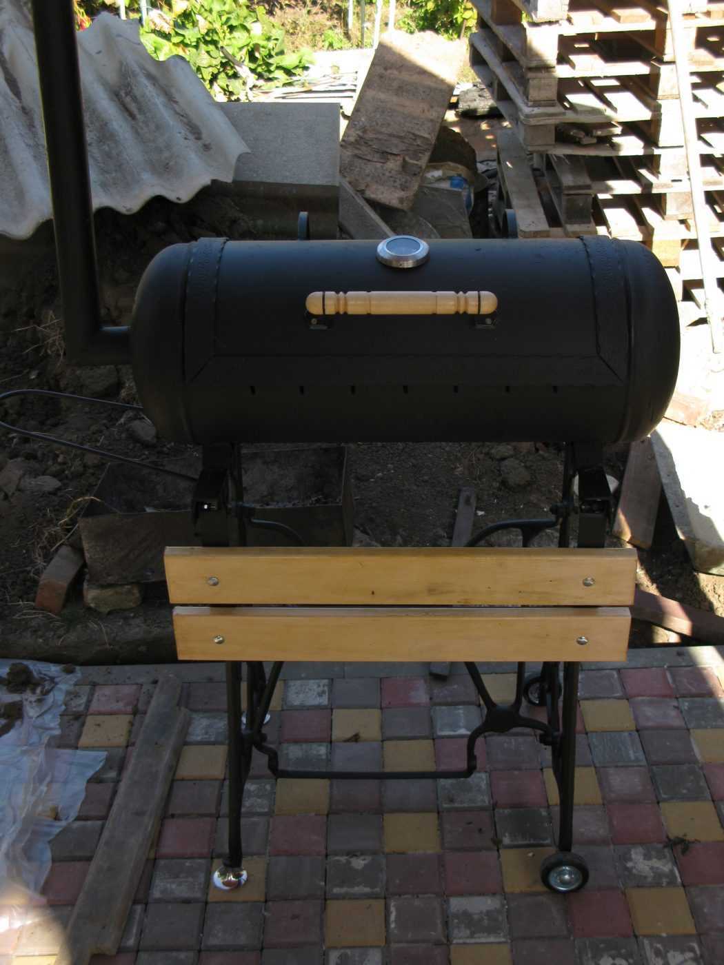 Металлическая емкость должна быть герметичной, поэтому швы должны быть сплошными. Если барбекю планируется перемещать по участку, одна пара ножек делается короче, оснащается колесами. Как правильно его сварить и какие брать размеры смотрите в следующем видео: