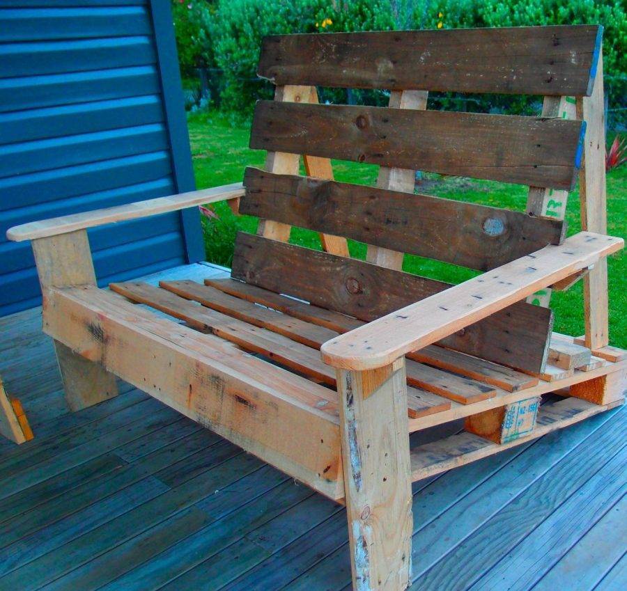 - если рядом установить еще по два поддона и к ним прибить спинку из деревянных реек — получится хорошая скамейка;
