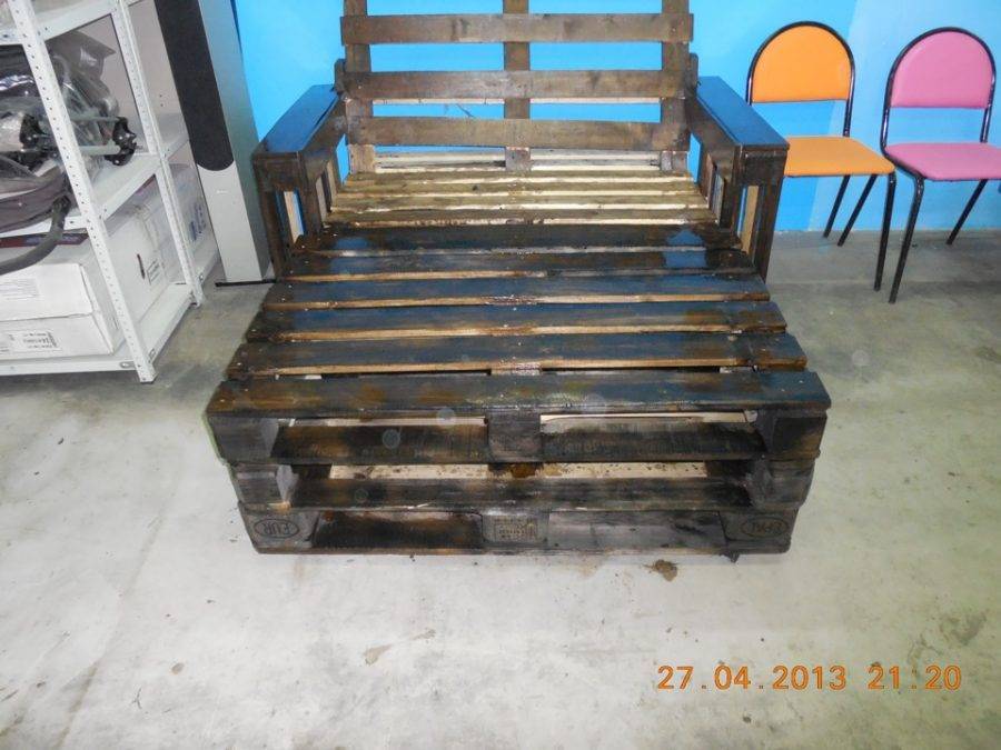 Теперь вы знаете, как сделать из поддонов диван и стол, для полного комплекта не хватает парочки кресел. Вообще не проблема. Вот инструкция с пошаговыми фото как сделать кресло из поддонов своими руками. Вид на картинке не очень презентабельный, но декор, это дело вкуса. Если его покрасить, накинуть покрывало, пару подушечек, будет то, что надо, можете поставить даже в комнате перед телевизором.