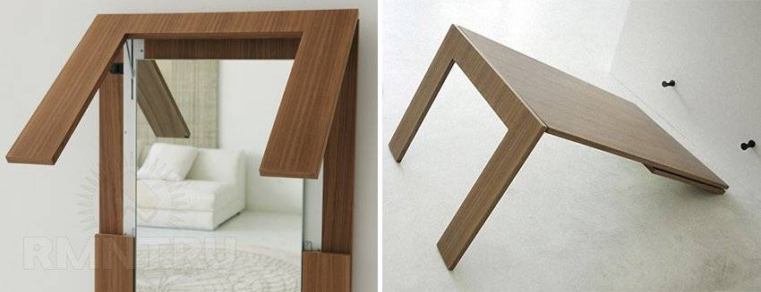 Женщины оценят стол-зеркало. Пообедав — сложите ножки и повесьте стол на стену, развернув зеркальной стороной. Крепежи под «зеркало» можно установить в коридоре, а при необходимости его снимать и переносить.