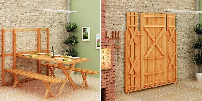 Для маленькой кухни в стиле кантри подойдёт откидывающаяся деревянная платформа со скамейками. Одним движением руки вы раскладываете полноценный обеденный стол.